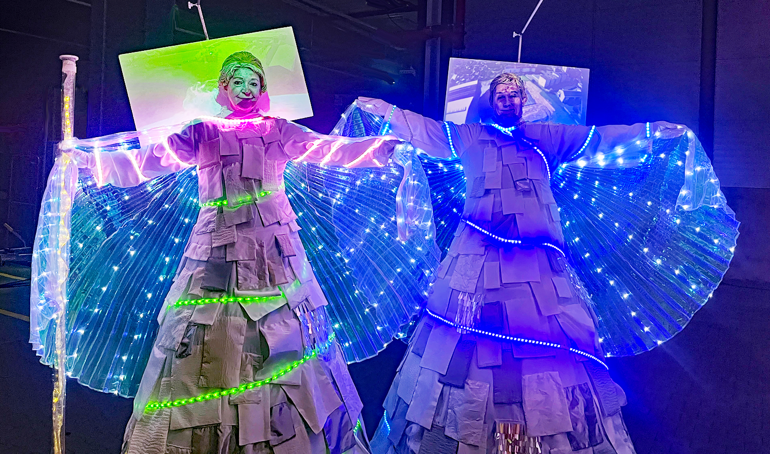 für Sie maßgeschneiderte Inhalte, die direkt auf die Leinwand und das Gesicht der Stelzenläufer projiziert