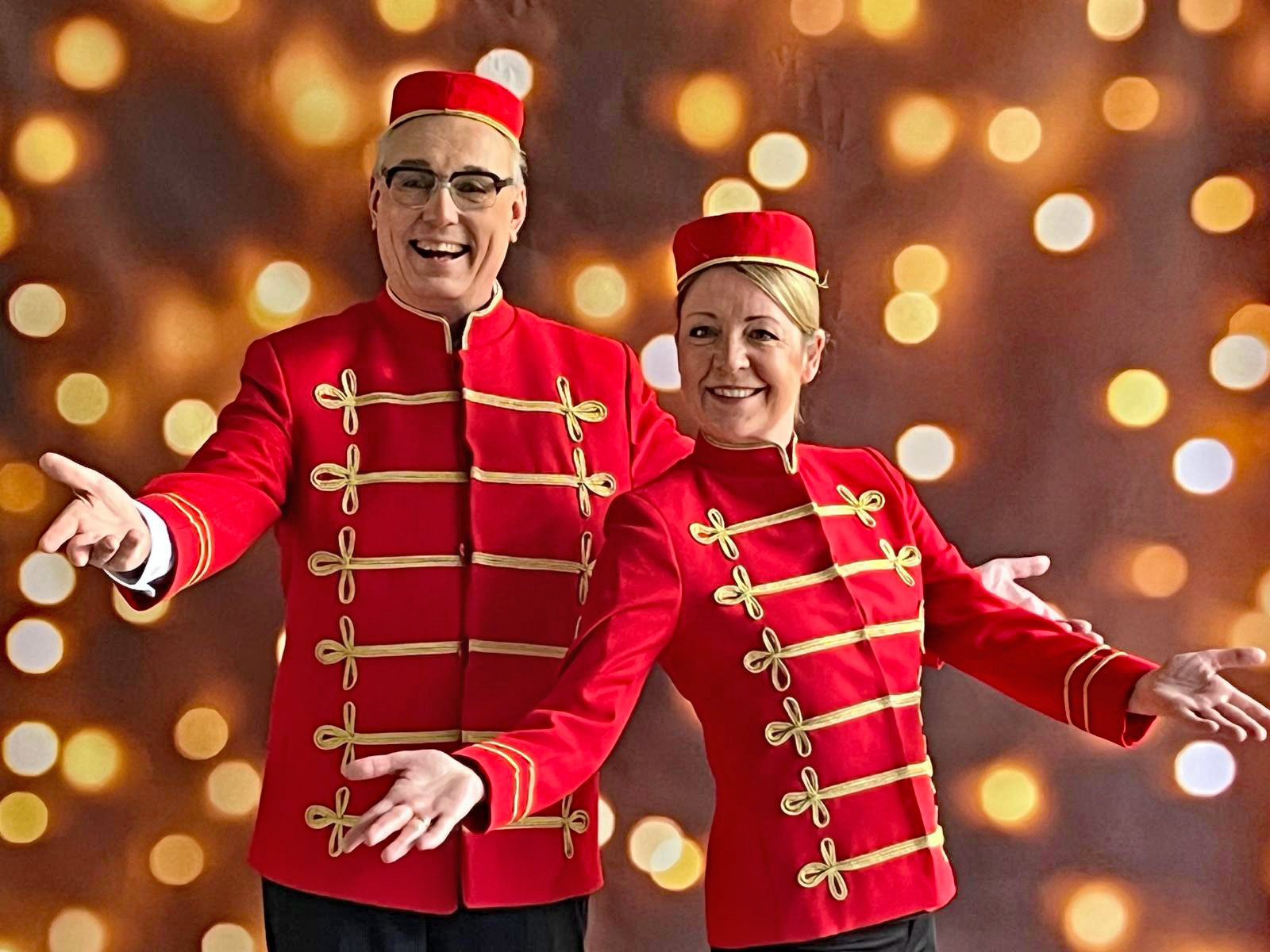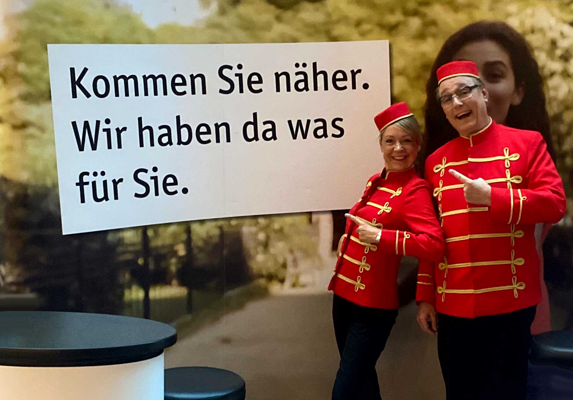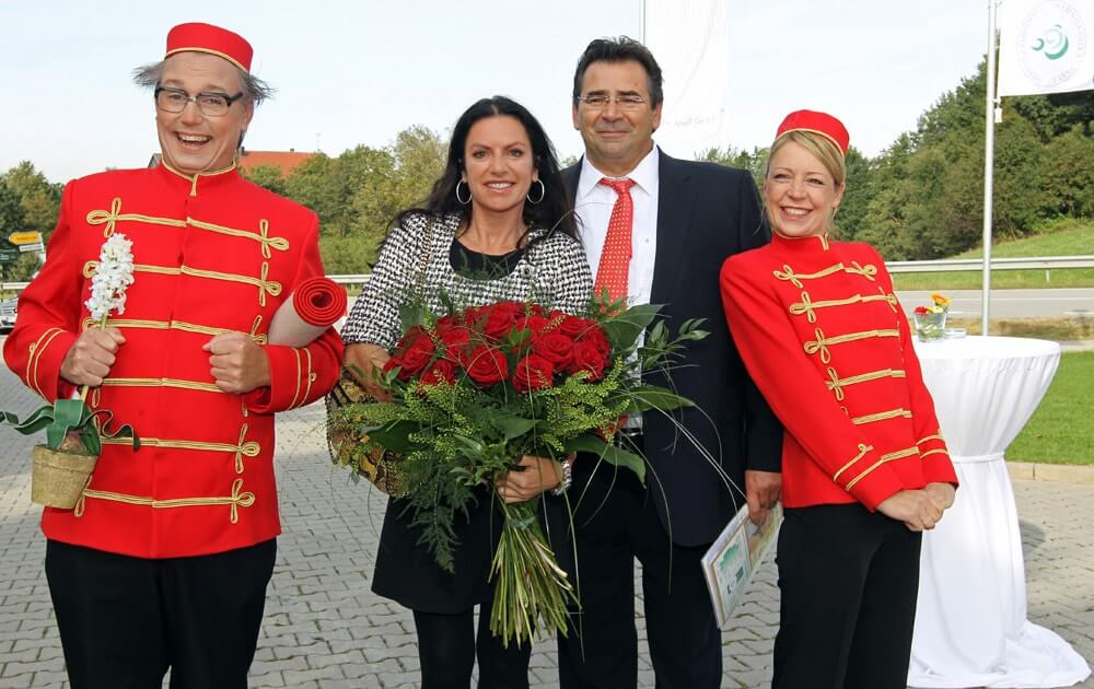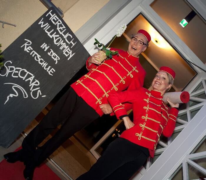 Spontan kommen rote Teppiche und weitere Requisiten zum Einsatz. Die Unterhaltungskünstler heißen Gäste humorvoll